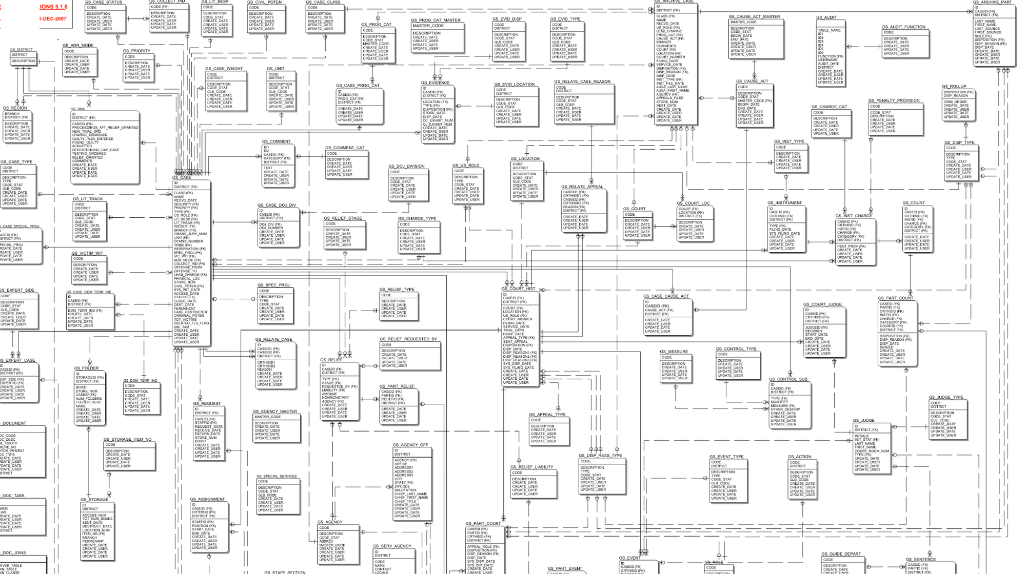 DOJ publishes a dataset called National Caseload Data which incorporates hundreds of different kinds of information about their activities, from employees to their assignments to the status of each individual case that they pursue and every filing within each case. (Some records are redacted, of course.) This dataset is extremely complicated, separated into (as of the latest release in November 2025) 28 different folders and hundreds of files, each with its own relationships to other files, data dictionaries, caveats, and issues. It’s a mess, albeit a well-documented mess (see the following image for a sample of the complexity in this dataset).