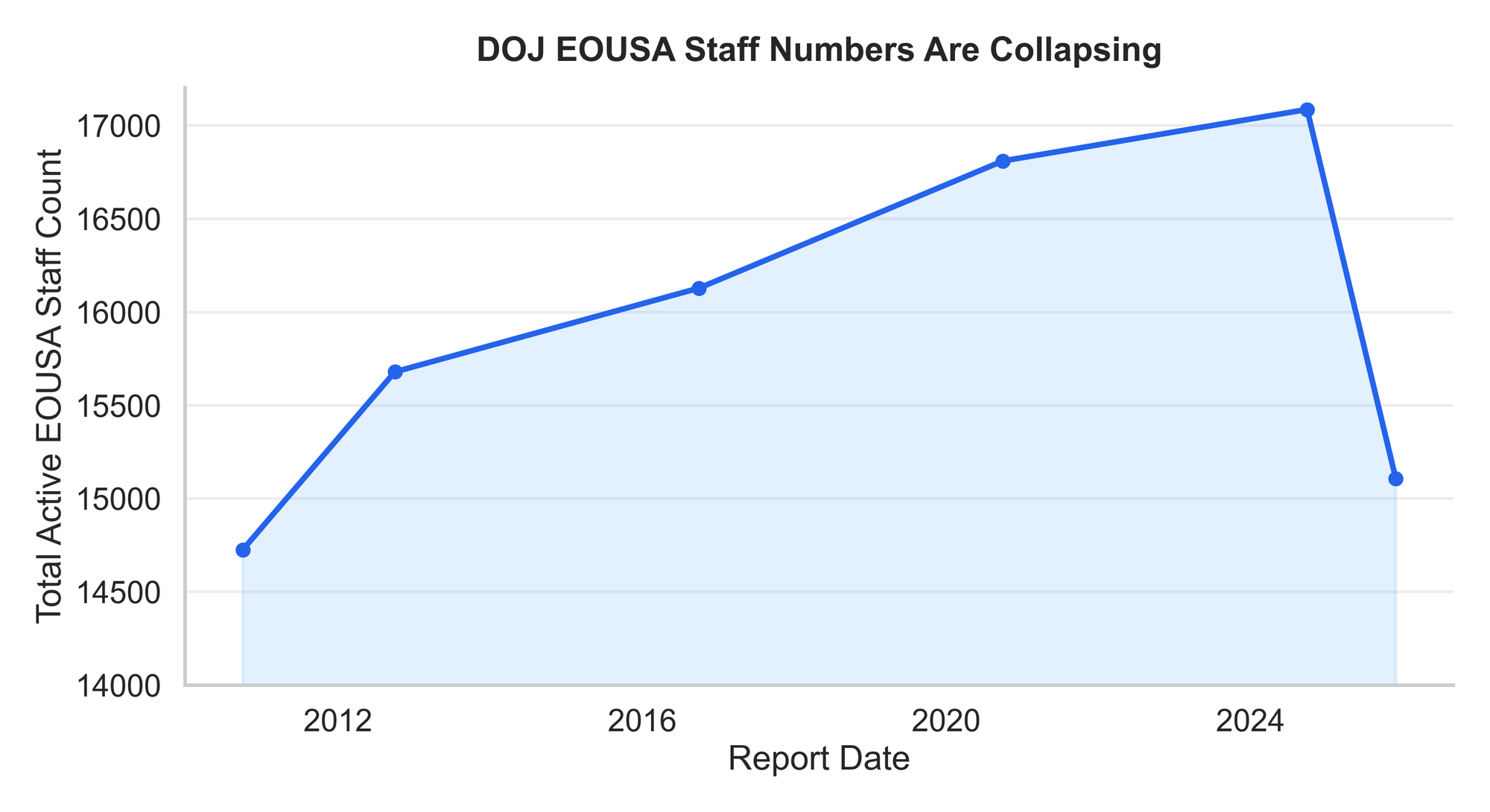 Edit (2/26/2026): Updated to clarify that the stats pertain to DOJ's EOUSA office. DOJ as a whole--including the FBI, DEA, and other agencies--has lost more like 6,000 employees.