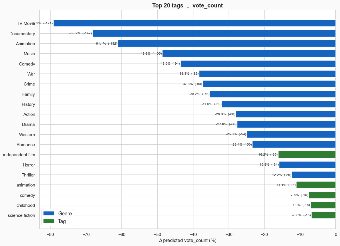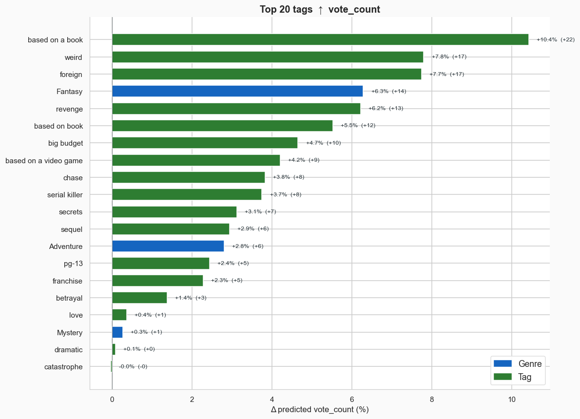 As one final interesting wrinkle, we can use the models to learn what kinds of descriptive tags contribute the most to a movie’s popularity and/or scores. The way this works is that I take each movie’s description and I attach the tag to the end of it, letting the model estimate how much that either boosts a movie’s score or detracts from it.