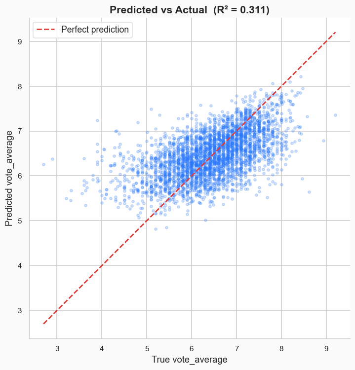 That means you can tell something that’s likely to be great from something that’s likely to be terrible. The R2 value is much lower (R2=0.31), however, which makes sense to me; the best plot, style, and budget in the world can’t guarantee that your lead actor will turn in an Oscar-worth performance, or that your editor won’t chop the movie into incoherence, and so on. You can contrast that with how many people will see the movie (proxied by vote count), where a high budget and a creative setting is likely to get people in the theater door, even if they don’t end up enjoying the movie.