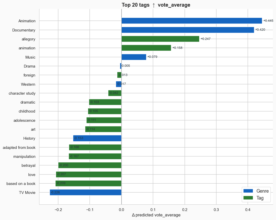 Turning to movie quality, some of the tags that boost quality the most are also the ones that reduce popularity. Genres like documentary and animation tend to be rated highly, but less watched. Meanwhile, movies based on books or video games are less liked, even though they are more popular (the same goes for sequels and franchises). Notably, no one likes teen movies.