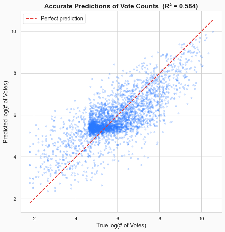 In short: quite well. Based on the description, tags, and budget, I can predict how many votes a film will get to within about 600 votes, for an R2 value of around 0.55.